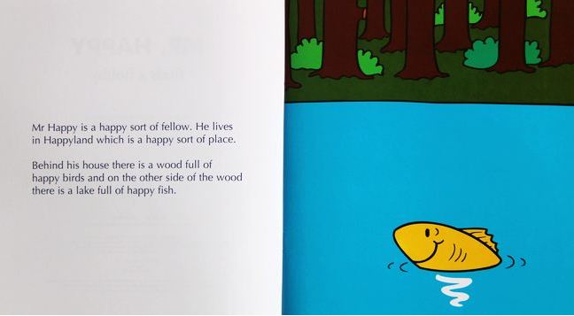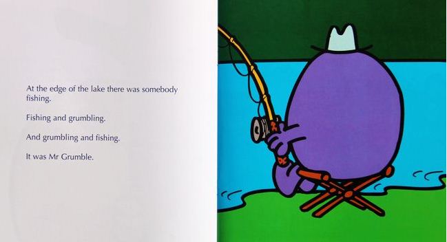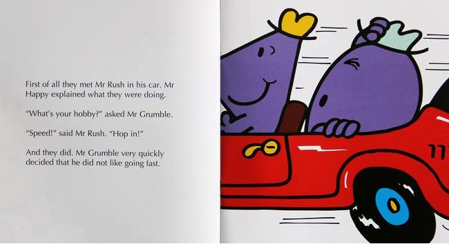 Mr. Happy 是全世界最快乐的人,他住在快乐岛屿上,岛上住着快乐的小鸟,湖里鱼儿也快乐地优游着。但是,某天Mr.Happy却听见在快乐岛上听到不属于快乐岛上的声音,那就是抱怨声!怎么会有人在美好的快乐岛上抱怨、发牢骚呢? Mr. Happy一看,原来是正在湖边钓鱼的Mr. Grumble在碎碎念! Mr. Grumble想要找一件自己喜欢做的事情,于是Mr. Quiet建议他可以去钓鱼,但是爱发牢骚的Mr. Grumble这么爱碎碎念,湖里的鱼怎么可能会上钩呢! Mr. Happy也希望Mr. Grumble跟他一样快乐,于是就帮助Mr. Grumble一同寻找会令他快乐的事情。他们拜访了好多人,Mr. Impossible、Little Miss Splendid、Mr. Nosey、Mr.Rush、Mr. Bounce、Little Miss Giggle...等等,但是一整天劳碌下来Mr.Grumble就是不停的发牢骚,没有一件事情是他感兴趣的,对于忙了整天的Mr. Happy来说,这一天还真是漫长!隔天一早,Mr. Happy的早茶都还没喝完,就火速的跑去找Mr. Grumble,告诉他一件他做了一定会开心的事情。 Mr. Happy到底是发现什么事情能够让爱发牢骚的Mr. Grumble露出微笑呢?