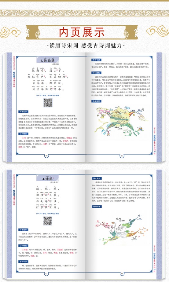 本书依据教育部颁发的《全日制义务教育语文课程标准》编写,完整收录了指定的75首古诗词。这本《思维导图画古诗:小学生必背古诗词》在编写过程中,充分考虑到小学生的认知特点,增强了诗词的可读性和趣味性。本书中的诗词加注了拼音,并有对应的配乐朗诵。诗词下面附有“作者简介”、“注词释义”、“古诗今译”、“诗文赏析”、“思维导图”等板块。此外,为古诗词绘制精美的思维导图是本书的亮点,学生也可以自己动手去补充和完善,真正做到学以致用,举一反三。本书更注重寓教于乐,让学生在听、读和画中快乐地学习和记诵这些古诗词,来增强对中国古代文化的了解,为以后接触更多的文化典籍打下坚实的基础。
