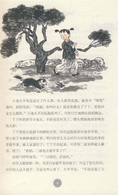 我去放飞鸽子,她穿着三妹的大褂子,拖着父亲的大布鞋,吃通吃通地跟着我,跑着跑着,鞋子掉了,回头穿上,又跟了过来;我去钓鱼,她就搬张小板凳,坐在旁边,我需要个什么东西,总是支使她:去,给哥哥把这个拿来!去,给哥哥把那个拿来!她觉得她很重要,因此很快乐。钓鱼是一件磨人耐性的事情,坐了半天,浮子却纹丝不动。小妹开始坐不住了,不停地闹着要回去,我期待着下一秒钟的收获,不愿放弃,就哄她安慰她,让她安静。当我重新坐在椅子上,盯着水面时,她捡起地上的泥块,啪地扔进水里,水面一下子漾开了,一圈一圈的涟漪向岸边扩展开去,我就挥动鱼竿嗷嗷吼叫:“回去揍扁了你!”她知道这是吓唬她的,并不害怕……小妹使我的那段寂寞岁月多了许多温馨,许多热闹。