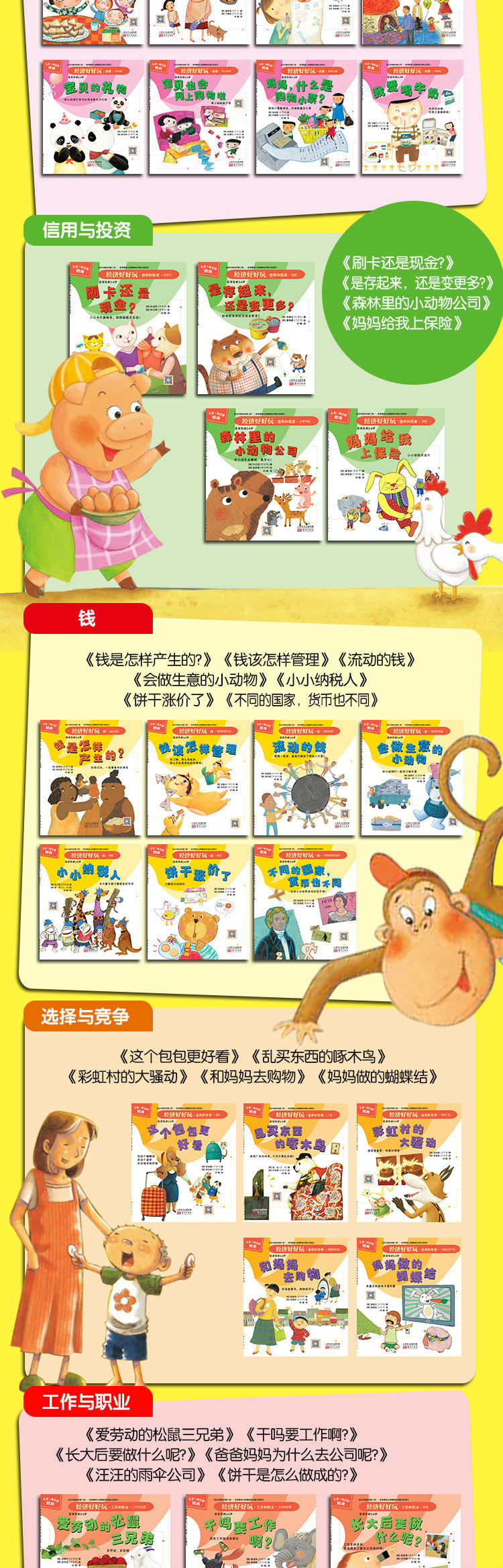 “给孩子的经济启蒙书”专注于金融决策观的解释和引导。告诉孩子们为什么不可有攀比之心,为什么在消费时要量入为出,而不是随心所欲,引导孩子们建立自主意识和责任感。深入浅出地解释了金钱世界的运作原理。比如告诉孩子们为什么不应该嫉妒他人,告诉孩子们世界上有许多金钱买不到的东西。为了适合孩子们爱涂爱画的特点,书里的插画没有完全上色,等待孩子们发挥自己的想象里,完成这些插画