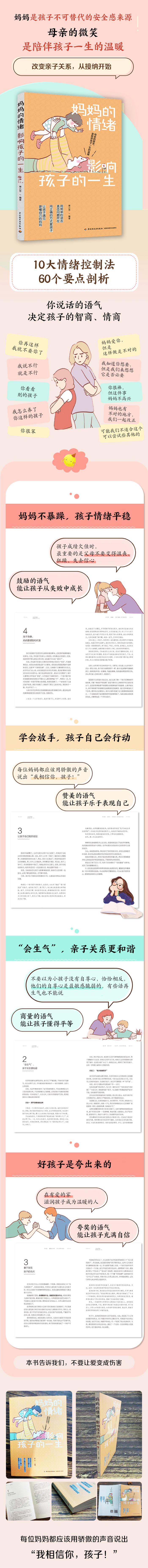 本书主要教授妈妈在孩子的成长过程中,怎样用正确的情感表达方式与孩子互动,帮助孩子成长。母亲的情绪对孩子的影响是不容忽视的,只有妈妈接纳了自己的不完美,才可以减少孩子的焦虑;只有妈妈情绪稳定,才可以给孩子提供巨大的安全感。从而帮助孩子形成健全的人格,让以后的人生能够一帆风顺。