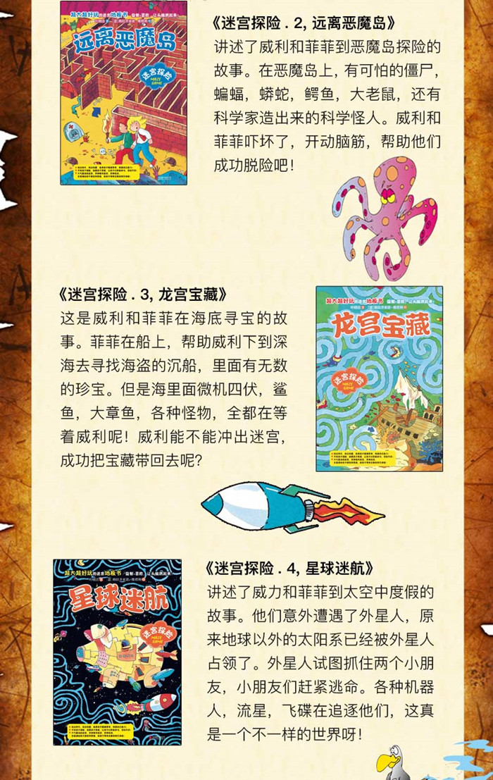 除了有趣的迷宫探险之外,还有考验观察力、分析力、判断力的《小侦探迷宫破案册》。试一试,看看你是几星小侦探?