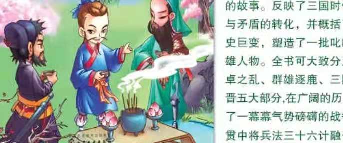 《三国演义》描写了从东汉末年到西晋初年之间近105年的历史风云,以描写战争为主,反映了东汉末年的群雄割据混战和魏、蜀、吴三国之间的政治和军事斗争,最终司马炎一统三国,建立晋朝的故事。全书反映了三国时代各类社会斗争与矛盾的转化,并概括了这一时代的历史巨变,塑造了一批叱咤风云的英雄人物。全书可大致分为黄巾之乱、董卓之乱、群雄逐鹿、三国鼎立、三国归晋五部分,在广阔的历史背景下,上演了一幕幕气势磅礴的战争场面。