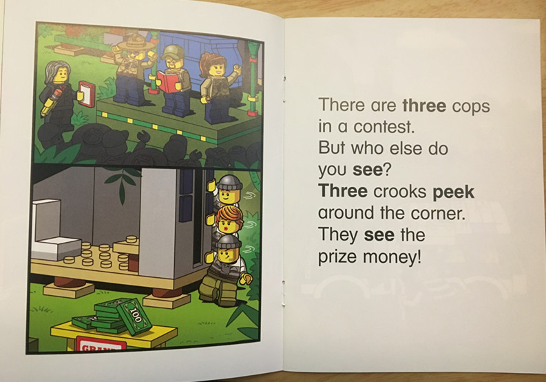 当然,这套phonics必然要有拼读的练习,只是沉迷情节就浪费了作者把乐高和拼读结合的本意啦!封面后的词汇全都在书中出现哟!这套书不是phonics教材,应该是有拼读基础的孩子的练习,或者是启发有单词基础的孩子发现字母组合的发音规律,再或者乐高迷刚开始英文启蒙的小朋友就干脆作为亲子阅读的绘本,等熟悉了故事之后慢慢的引导培养听音辨音能力。