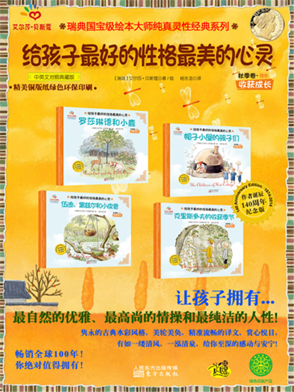 这套绘本精选了艾尔莎?贝斯蔻最著名、最具代表性的16部作品,按照内容特点组合成春夏秋冬四卷。每一册不仅完全保留了原作的所有文字和图画,还配有精准传神的译文。年龄较小的孩子,可在家长朗读或讲述故事内容的同时翻看图画,培养理解力和语言能力;识字的孩子可以自己独立阅读中文;开始学习英文的孩子可对照原文进行平行阅读。因此,这套书可以说是适合各个年龄层次的儿童。此外,色彩柔和、细节丰富的图画,也让这套书具有很高的收藏价值。