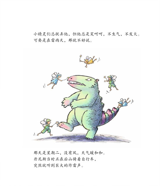 本书的开篇这样介绍到:“小怪物丹尼斯五岁多一点儿,老实说,他胖乎乎的,不怎么可怕。对不说话的动物、虫子和花草,他都很友好,还会给上年纪的婶婶让座呢!……小精灵们总捉弄他,但他总是笑呵呵,不生气,不发火。”这样的小怪物,是不是让人觉得特别可爱温和?恨不得立即找到他,结为朋友。不过,接下来的一句才是重点哦“可要是在雷雨天,那就不好说!”在其姊妹篇《床底下的怪物》中我们了解到丹尼斯很害怕人类来抓他。那么,这本书,又将会描述一个有关丹尼斯的什么有趣故事呢?