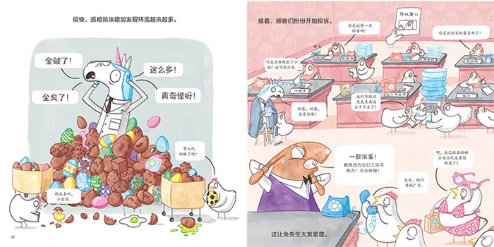 为了赚更多钱,贪心的兔先生强迫鸡们吃更多巧克力,下更多巧克力蛋。但是,鸡们超负荷的劳动导致巧克力蛋质量严重不合格,出现了很多“坏蛋”, 甚至有的巧克力蛋还孵出了小鸡!顾客们的投诉纷至沓来,鸡们也不堪忍受举行了大罢工,巧克力工厂陷于瘫痪。不甘心的兔先生亲自上阵,但是,他很快发现一个人的力量非常有限,他手忙脚乱地掉进了巧克力锅里……
