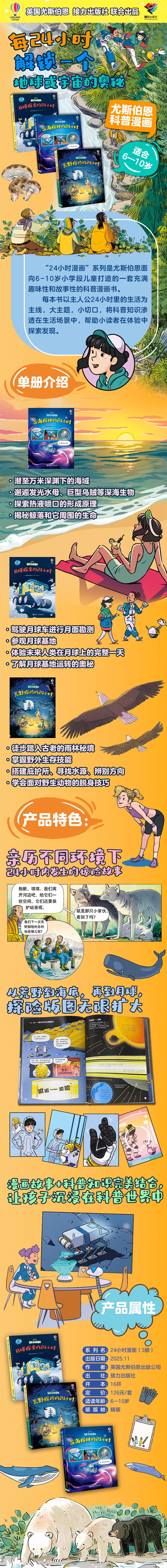 《荒野探险的24小时》是一本适合6—10岁孩子的科普漫画书,讲述了琪琪、莫约和迪叔叔三人在大熊雨林探险的一天。荒野中险象丛生,三人意外丢失了*木舟,漂离了原定的航线。在这片Z原始的荒野之地上,探险家面临着迷失方向、失去能量补给,甚*是熊、狼等野兽袭击的挑战,他们必须沉着冷静才能顺利脱困。书中展现三名探险家在野外生火、取水、搭建庇护所、辨别方向及躲避野兽的生存技能,丰富的野外科普知识渗透于生活场景,同时画风搞怪,语言轻松,符合孩子们的阅读喜好,让孩子在阅读故事时轻松学习知识。