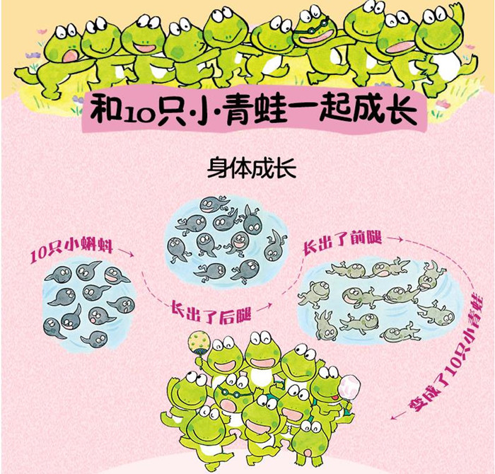“10只小青蛙系列”是一套反映孩子在集体生活中自由成长的图画故事书。套书共18册,讲述了10只小青蛙团结协作,一起战胜生活中各种困难,一起快乐健康成长的故事。他们一起战胜凶猛的小龙虾,躲避危险的漩涡和龙卷风,也一起参加春游、露营、运动会;他们一起经历春夏秋冬、四季变化,也一起过七夕、中秋、新年;他们一起认识美丽的荷花、能止血的艾草,也一起了解蝙蝠、蛇、小龙虾、泥鳅等动物的习性……不管什么时候,他们都始终为了同伴、为了未来,勇敢前行、快乐成长。10只小青蛙就和幼儿园的小朋友一样,天真烂漫、机智勇敢、团结热情,什么都不怕,对这个世界充满了新鲜感。