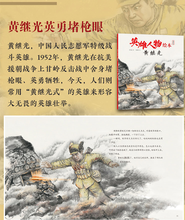 《英雄人物绘本·黄继光》英勇堵枪眼的志愿军战士――黄继光。黄继光,中国人民志愿军特级战斗英雄。1952年,黄继光在抗美援朝战争上甘岭反击战中舍身堵枪眼、英勇牺牲,今天,人们则常用“黄继光式”的英雄来形容大无畏的英雄壮举。他的英雄壮举,激励和教育了几代人。他那奋不顾身的大无畏英雄气概为人们所景仰,他的英雄事迹为人们所传颂。本书讲述的是黄继光的生平和英雄事迹。
