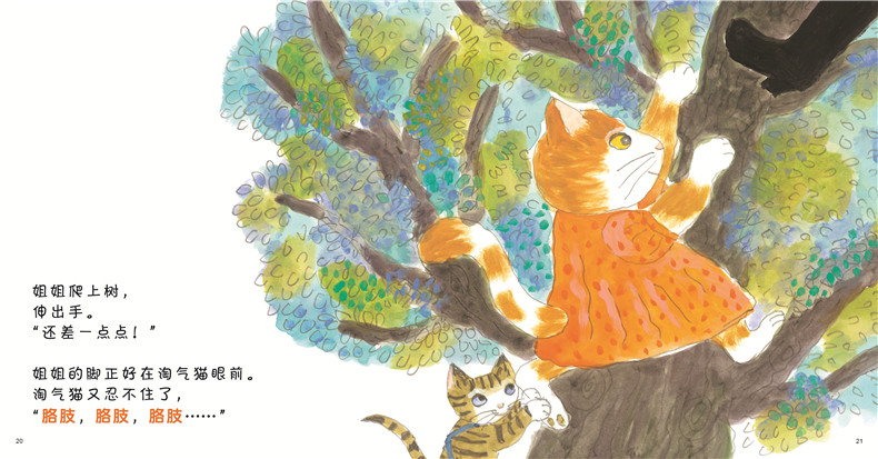 淘气猫和姐姐赶忙去追鞋子,没想到从树上掉了下来。