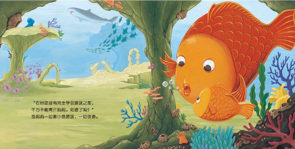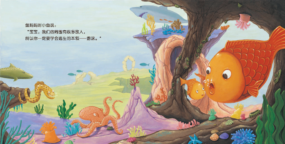 鱼妈妈对小鱼说:“宝宝,我们的周围有很多敌人,所以你一定要学会逃生的本领——游泳。”“在你还没有完全学会游泳之前,千万不能离开妈妈。知道了吗?”鱼妈妈一边教小鱼游泳,一边说道。……