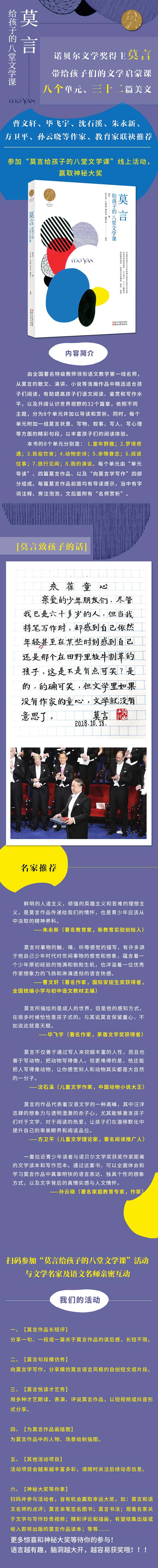 本书所收录的篇章,是从莫言从事文学创作二十余年所发表的小说、散文、演讲等作品中,遴选出的最适合小学生阅读、对于小学生的学习和成长都有教育意义的篇目或章节。这些篇目章节经罗才军等在一线从事小学教育的优秀教育工作者编选后,根据小学语文教学辅导的特点,进一步注释和加工成书。文学作品集。