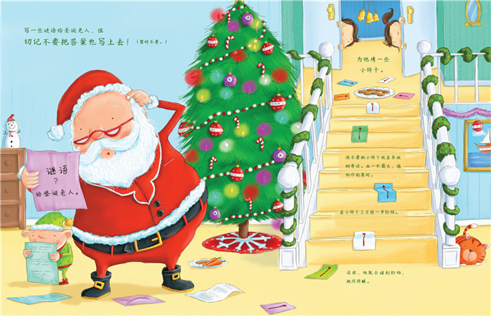 圣诞老人对孩子们来说是一个神秘的存在。亲眼看一看圣诞老人,是很多孩子的想法。 到了圣诞前夜,想捉住圣诞老人的机会也来了。想对圣诞老人说的话要提前准备好。要记住,捉圣诞老人不能用粗鲁野蛮的招数,而是要有一些机灵巧妙的好点子。写给圣诞老人的谜语,给圣诞老人烤的小饼干……这些都不可少。天黑之后,要留心窗外有没有圣诞老人的动静。如果运气够好,你可能真的能捉住圣诞老人!