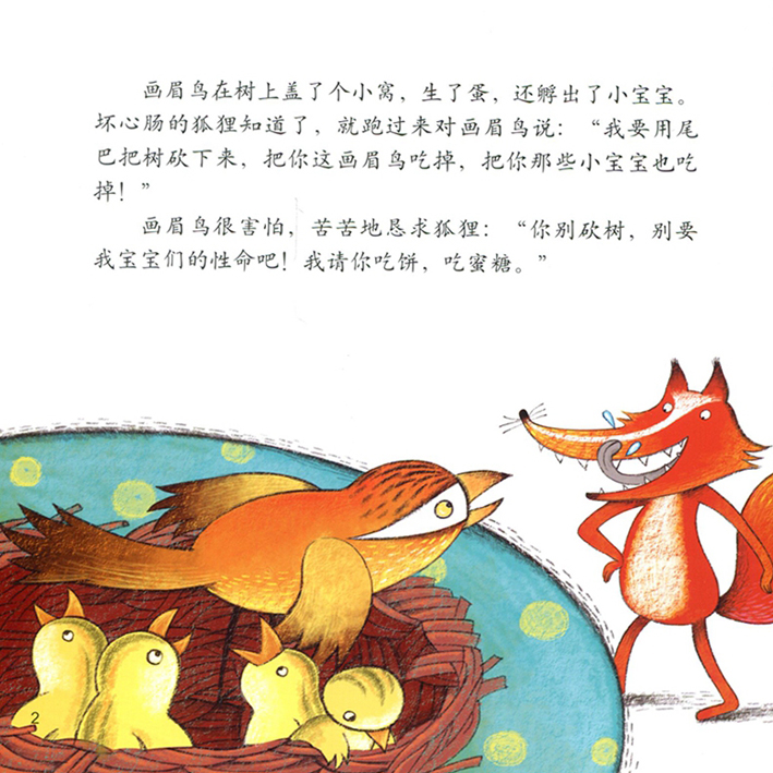画眉鸟在树上盖了小窝,还在里面孵出了小宝宝。狐狸说画眉鸟不请他吃饭喝酒,逗他笑;他就把树,砍掉吃了画眉鸟的宝宝。就这么一次又一次让画眉鸟迫于狐狸的威胁请他吃饭喝酒,逗他笑。后来狐狸又对画眉鸟说你还没吓唬过我,画眉鸟就把狐狸带到猎人住的地方吓唬狐狸,从此以后狐狸再也不敢去找画眉鸟了。画眉鸟安心抚养自己的孩子了。