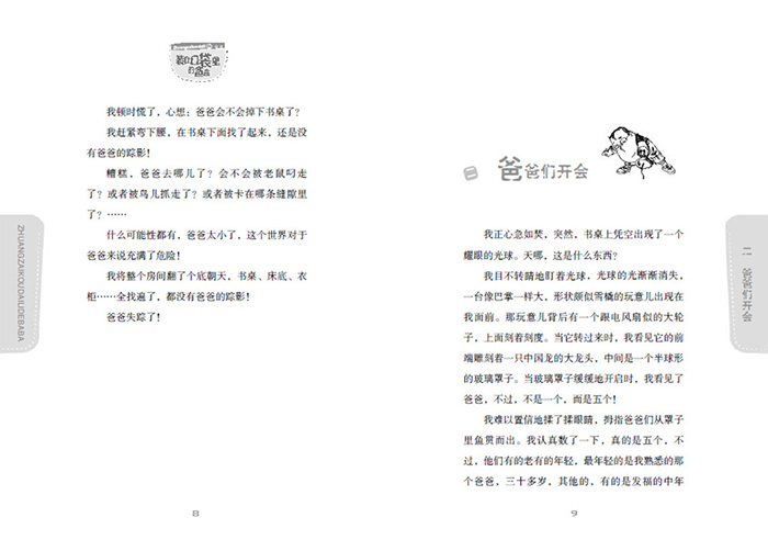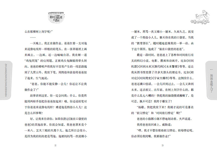 一爸爸去哪儿了“有个恐怖分子回到过去,在他父亲出生前杀害了他的祖父。既然祖父已死,就不会有其父亲,也不会有他;既然恐怖分子不存在,又怎么能回到过去,杀死自己的祖父呢?”“有个时间旅行家去了未来,得知未来的自己将会遇到一场车祸,于是,他在车祸发生前,采取了避免出现车祸的行动,未来的车祸,因此没有发生。那么,如果未来没有发生车祸,他又是怎么在未来得知自己会出车祸的呢?”“布朗博士乘着时光机去了未来,他在一棵树上用小刀刻了一行字——‘布朗博士到此一游’,当他返回过去时,把那棵还只是树苗的树给砍了。那么请问,他在未来怎么可能看到被砍了的树、又怎么在那棵树上刻字呢?”一天晚上,我正在做作业,爸爸扛着一支对他来说像电线杆一样粗的铅笔头,在一张草稿纸上画来画去,一边画,还一边喃喃自语。我在解一道“鸡兔同笼”的应用题,正被鸡头兔脚搞得晕头转向,爸爸的嘟哝声将我好不容易产生的一线思路抛到了九霄云外,我放下笔,用拇指和食指将爸爸捏了起来,生气地说:“爸爸,你能不能安静一会儿?你还让不让我做作业了?”故事讲到这里,你一定会问我:什么,你竟然能用两根手指把你爸爸捏起来?哦,你还说铅笔对于你爸爸来说像电线杆?难道他是拇指小人儿?这是怎么回事啊?好,让我来告诉你:如果你读过《装在口袋里的爸爸》的其他故事,你就会知道,我爸爸原来是个一米八、五大三粗的大高个儿,他之所以会变小,是因为我的妈妈老是骂他。他被妈妈骂一次就缩小一厘米,再骂一次又缩小一厘米,久而久之,就变成了一个拇指小人儿,整天待在我的口袋里,当我的“教育部长”,随时随地监视我的一举一动。由于这个原因,他成了“装在口袋里的爸爸”。