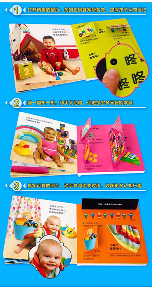 这是一套引自英国DK出版公司的翻翻发声书。本书中有超过17张翻翻页,书中有5个场景设定,左页有引导孩子去猜想的问题,右页都具有翻翻的功能,其中一个底下藏着要找的东西,更有趣的是打开某一页会发出声音。非常适合宝宝早期想象力、早期思维和记忆能力的培养。书中通过一问一答的形式,鼓励孩子动手去翻开每个场景中的翻翻页,孩子猜对正确答案时发出相对应的声音,加强孩子对事情的理解认知,也增强了亲子之间的互动。