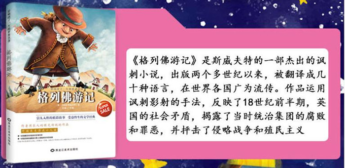 《格列佛游记》是一部长篇游记体小说,以其尖锐深邃的讽刺艺术而名垂世界文学史。书中通过格列佛船长自叙,描绘了主人公在小人国、大人国、飞岛国和“慧骃”国的奇特经历,充满了异想天开的情节和引人发笑的妙趣。作者以夸张渲染时代的生气,借荒唐痛斥时代的弊端,不留情面地对18世纪前半期的英国社会进行全面的批判。本书不但思想内容深刻,而且艺术形式完美,是对中国*影响力的外国文学作品之一。