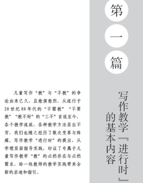 本书从头到尾都贯穿着这样一种理念:写作教学要凸显儿童立场——“为儿童而教”, 一切的教学行为都从儿童本位出发,以儿童发展为目标,形成前后连贯的童年写作中轴线;写作教学要关注写作过程,时时观照写作运思,激活生活经验,调用阅读积累,组织同伴合作,促进表达欲望产生,直至言语表达顺利倾吐而出。将写作与儿童的生活、发展相联系,在提升儿童写作能力的同时,促进儿童的发展。