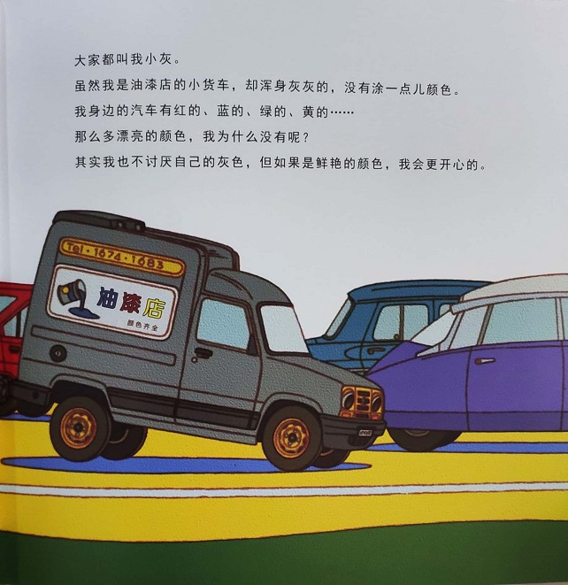 小灰虽是油漆店的小货车,可是浑身灰灰的,没有一点鲜艳的颜色,他很羡慕自己身边那些五颜六色的小汽车。一次他给专门研究颜色的叔叔送货时,提出自己也想要换个颜色。叔叔用专门的试色设备给他试颜色,小灰却怎么也挑不出自己满意的颜色。后来他请叔叔把所有的颜色都混在一起,给他调一个最漂亮的颜色。可是,天哪!怎么所有颜色混在一起却变成了灰色,原来小灰的灰是五彩缤纷的灰色啊。