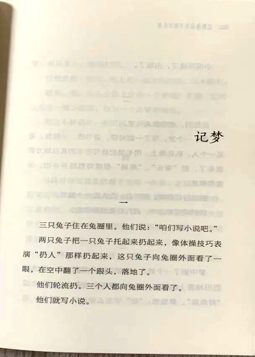 三只兔子住在兔圈里。他们说:“咱们写小说吧。”两只兔子把一只兔子托起来扔起来,像体操技巧表演“扔人”那样扔起来,这只兔子向兔圈外面看了一眼,在空中翻了一个跟头,落地了。