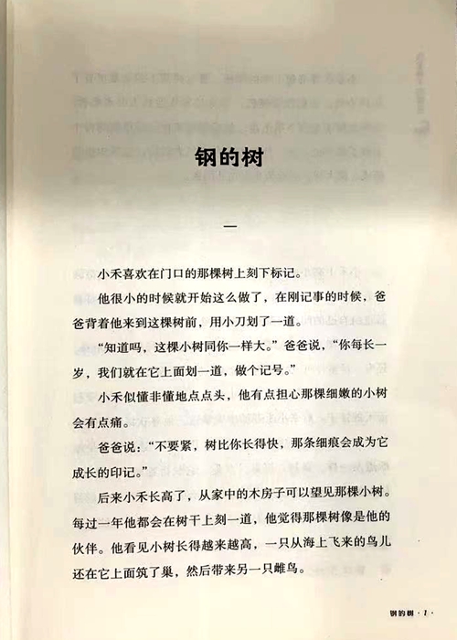 小禾喜欢在门口的那棵树上刻下标记。 他很小的时候就开始这么做了,在刚记事的时候,爸爸背着他来到这棵树前,用小刀划了一道。 “知道吗,这棵小树同你一样大。”爸爸说,“你每长一岁,我们就在它上面划一道,做个记号。” 小禾似懂非懂地点点头,他有点担心那棵细嫩的小树会有点痛。 爸爸说:“不要紧,树比你长得快,那条细痕会成为它成长的印记。” 后来小禾长高了,从家中的木房子可以望见那棵小树。每过一年他都会在树干上刻一道,他觉得那棵树像是他的伙伴。他看见小树长得越来越高,一只从海上飞来的鸟儿还在它上面筑了巢,然后带来另一只雌鸟。