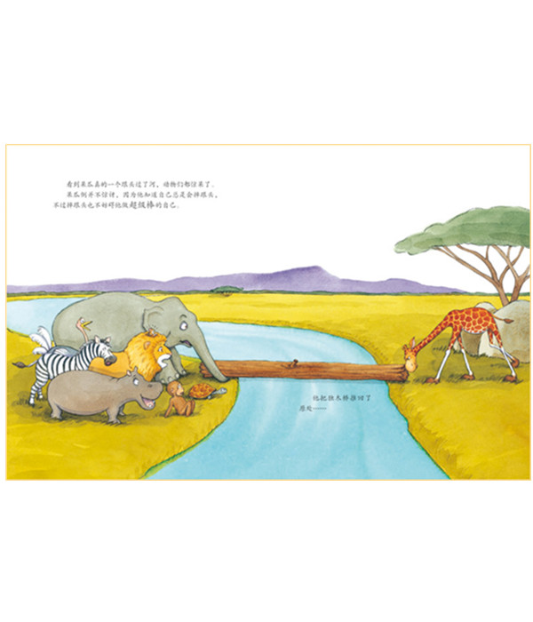 一个教给孩子要充满自信的故事。格鲁特是一只笨拙的小长颈鹿,由于他的笨拙,大家都讽刺地叫他“好棒的格鲁特”。而他因从小听从爸爸妈妈的教诲,做任何事都要尽自己最大的努力,所以他从来都是自信满满的。一天,小河的木桥被冲到了另一边的岸上,当所有的动物都认为自己不可能跳到对岸,格鲁特更不可能跳过去时,格鲁特却充满自信地飞驰过了小河!