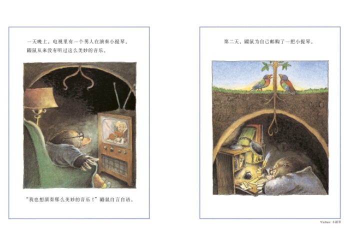 《鼹鼠的音乐》的故事中,行文皆以鼹鼠的角度来展现,但在图画中,却从鼹鼠家的一小幅画面,逐渐扩展延伸至地面上的世界,以十分美丽而富有感染力的形式,将音乐的巨大力量展现无遗。 这虽然是一本由图画和文字构成的图画故事书,画面却带给我们关于听觉的丰富想象。看着鼹鼠忘我地演奏小提琴,以及地面上的听众们陶醉聆听的画面,我们仿佛也听到了从某个地方传来的悠远又美妙的音乐。