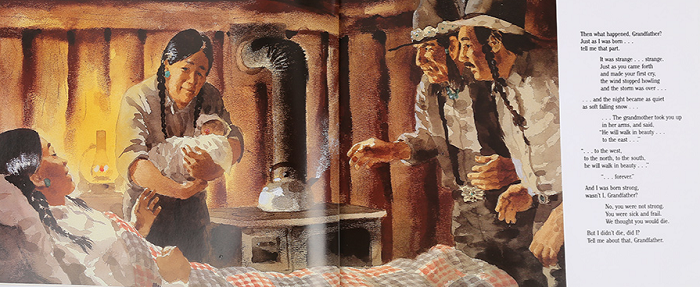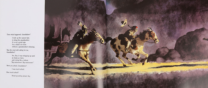 在月空之下,一个印第安男孩与祖父伴着篝火席地而坐,听祖父讲他出生的故事。