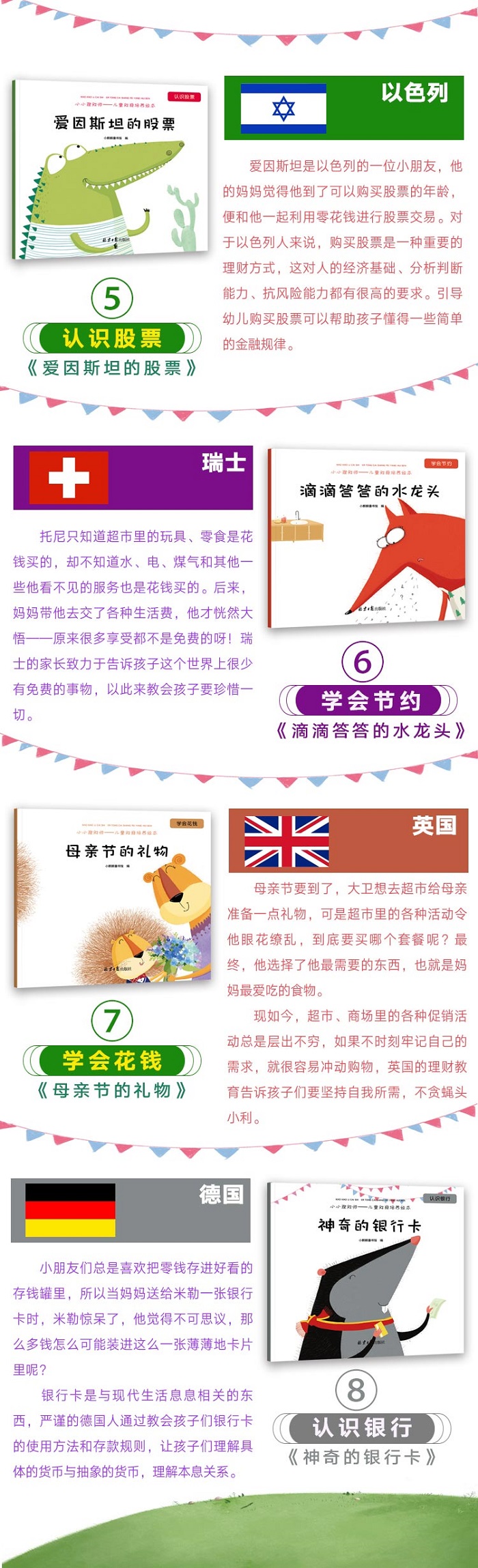 财商是一种认识金钱、管理金钱的能力。对儿童财商的培养有利于让孩子对金钱、对财富有积极的、正面的认识。一个孩子是否具有较高的财商,是否具有较好的理财习惯,这并非取决于先天的遗传,绝大多数需要后天培养。而每个国家在培养幼儿财商时各有侧重。本套绘本在研究了各个国家培养孩子财商的不同方式后,选取最为典型的八个国家,由资深绘本作者创作了八个有趣的故事,让家长和孩子在有趣的阅读中,潜移默化的学习到最先进的理财观念。