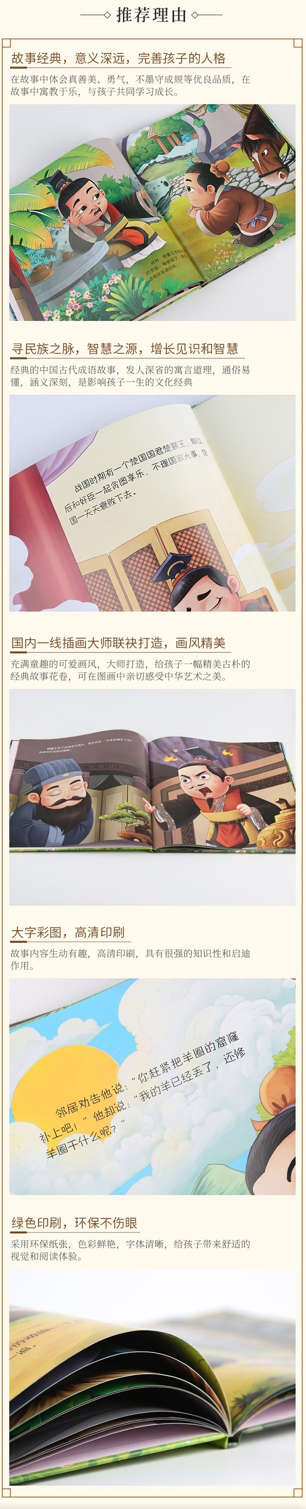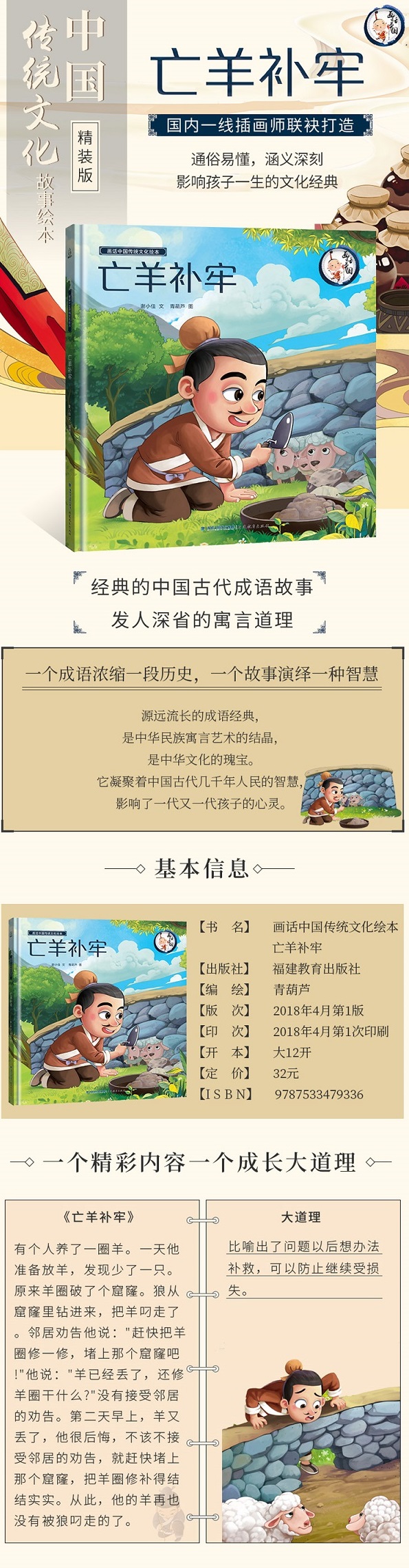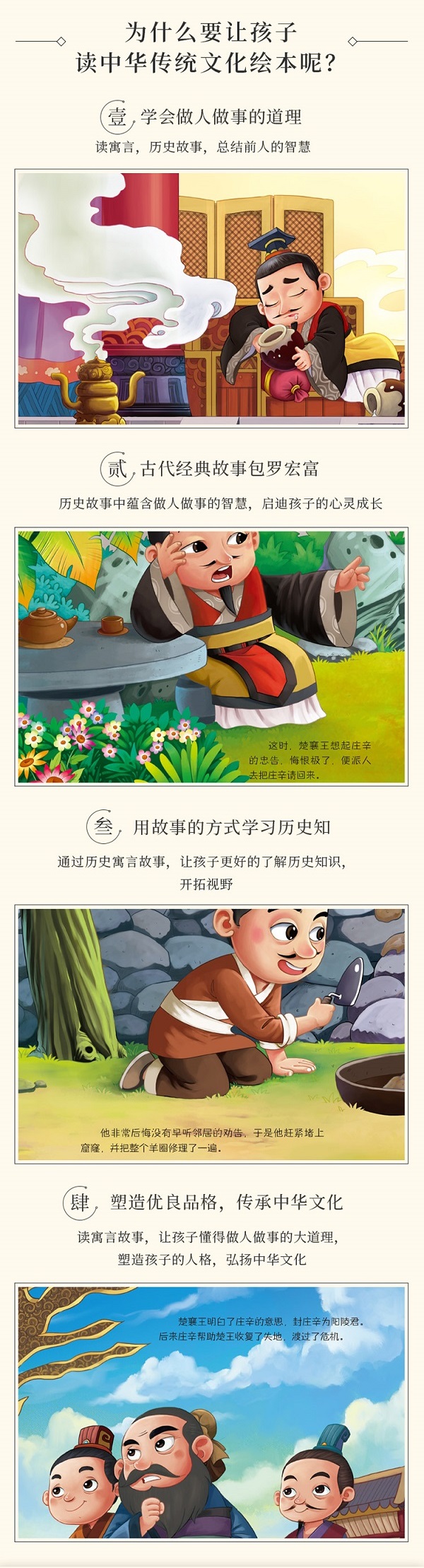 本套丛书选取十个中国经典的成语故事,由*一线插画师联袂打造,展现给读者一幅幅精美古朴的经典故事画卷,有着浓浓的中华艺术之美。 《画话中国传统文化绘本》设计采用12开的大开本大字,跨版超大图,绝美的中国风插画 ,能够产生强烈的视觉冲击效果,这套浸润心灵的中国传统文化经典 适合小学生的课外读