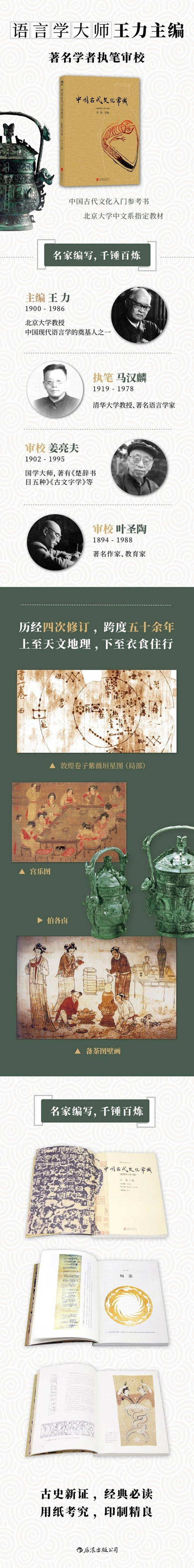《中国古代文化常识》是北京大学王力教授主持并召集众多专家共同编写的关于中国古代文化常识的简明读本,出版46年来前后历经4次重要修订。到今天仍然是大众认识中国古代文化面貌最重要、最全面的基础参考书。全书分礼俗、宗法、饮食、衣饰等十四个方面。第四次修订版特聘请在美国任教的汉学专家刘乐园(LewisEden)。以中国考古学黄金时代的成果为出发点,精选图片,改谬补漏。从考古学和人类学的角度增补最新文化研究成果,通过近世考古发现与传统文献相结合的“古史新证”,勾勒出情趣盎然的中国古代文化生活图景。