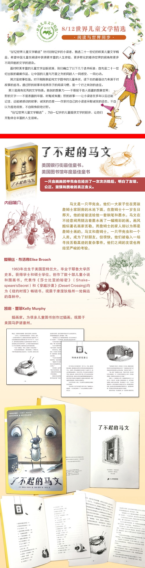 马文一家挖出了三问宽敞的房子。他的父母常常说,这个地方很 :温暖,因为热水管就嵌在墙里;湿润,这使得钻洞 容易;黑乎乎的还有些霉味,像他们曾经住过的所有房子。 棒的是,隐隐约约藏在一侧的白色塑料垃圾桶,提供了源源不断的废弃物,苹果核、面包屑、洋葱皮、糖纸,这让柜子成了一个理想的觅食之地。 马文是一只甲壳虫,和他的亲戚们一样,有着闪亮的黑壳、六条腿和出色的夜视力。他们不大也不小,就像普通的甲壳虫那样,比一粒葡萄干大不了多少。可是,他们很敏捷:善于爬墙、迅速窜过台面、从紧闭的门下面溜过去。他们住在庞帕戴一家的大公寓里,就在纽约。 早上,马文醒来时发现家里一片喧闹。通常, 里 开始的声音,是隔壁父母轻轻的“窸窸窣窣”声,以及庞帕戴家厨房水槽里罐子的“叮叮 ”声。可是 ,他听到的是庞帕戴夫人高跟鞋疯狂的“噔噔”声,还有她焦急而尖厉的叫喊声。正当他好奇地想着到底发生了什么事的时候,他的妈妈急急忙忙跑来找他。 “马文!”她喊道,“快来,亲爱的!有紧急情况。” 马文从柔软的棉花球——他的床里爬出来,半睡半醒地跟着她走进起居室。马文看到,他的父亲和叔叔阿尔伯特,还有堂妹