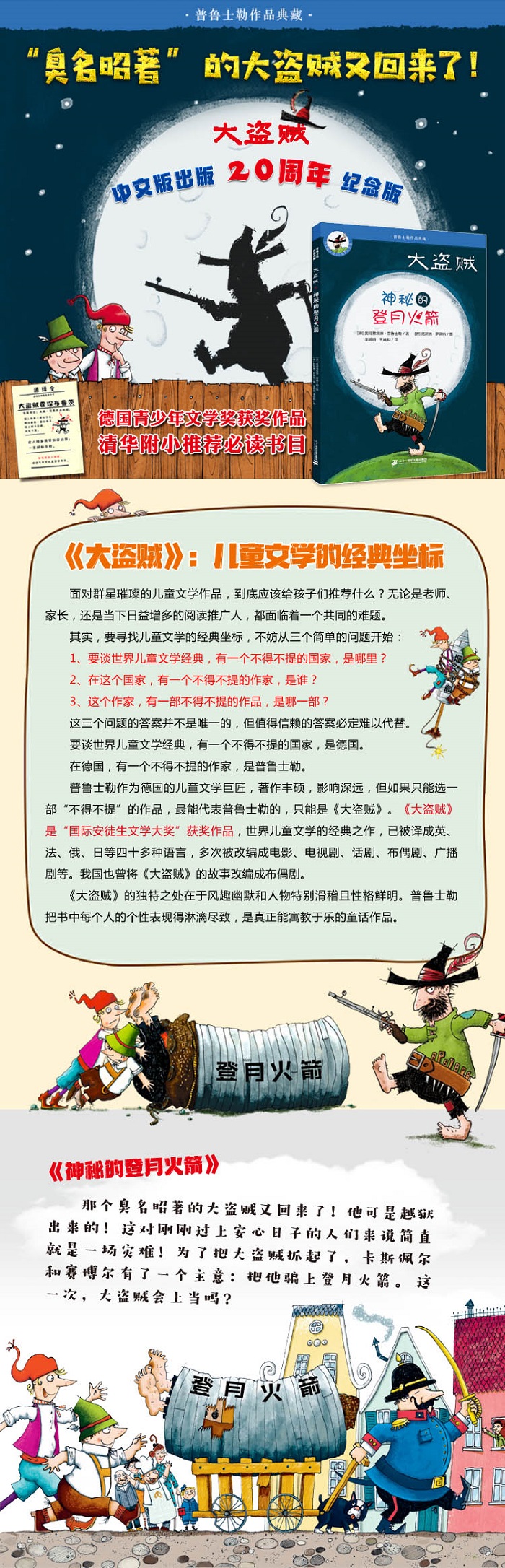 大盗贼又回来了!这次,大盗贼想要登上月球。不过,首先他得制造出一个登月火箭。他能成功吗?卡斯佩尔、赛伯尔和警察狄莫瑟尔会阻止他疯狂的行动吗?“大盗贼”系列是“国际安徒生文学大奖”普鲁士勒获奖作品,世界儿童文学的经典之作,已被译成英、法、俄、日等四十多种语言,多次被改编成电影、电视剧、话剧、布偶剧、广播剧等。我国也曾将《大盗贼》的故事改编成布偶剧。