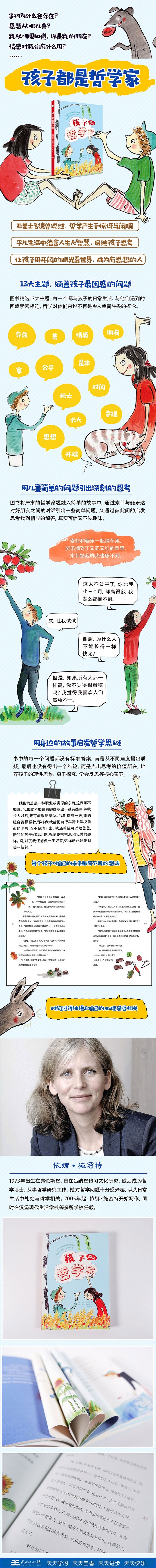 引进于注重思辨的德国,激发孩子的哲思意识 德国人素来做事严谨,注重思辨,书中往往都能找到探讨哲学话题的痕迹。图书将严肃的哲学命题融入简单的故事中,而故事的场景设置又在孩子日常的生活情境中,孩子容易产生共鸣,与主人公斐乐、索菲一起讨论遇到的问题,激发哲学思维 以小见大,平凡的生活中蕴含着人生的大道理与大智慧 图书内容并非简单枯燥的说教和解释,而是小中见大,每个主题都与孩子的日常生活、与他们遇到的困惑紧密相连,从而让孩子觉得哲学不再是令人望而生畏的概念,而是与人生、与自己生活息息相关的具体事物,甚至是一种切身的感觉和体会。 13堂简单的儿童哲学启蒙课,启发孩子思考,建立积极的人生观与世界观 正文通过孩子日常发生的一些简单问题探讨了关于存在、美、幸福、情感、朋友、思想、公平、死亡、时间等13个哲学命题,引发孩子深刻思考,帮助孩子更好地理解人生,慢慢形成健全的人生观与世界观。 有助于培养孩子独立的人格和自由的精神,形成勤于思考的习惯 从生活中*常见的好奇与困惑出发,主人公斐乐与索菲经常通过相互问答、反问追问的方式进行多角度的分析思考,发散思维,有助于培养孩子善于质疑、乐于思考的习惯以及独立自主的性格。