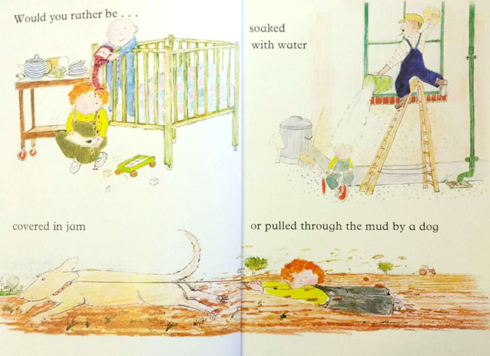 Given the choice, we think most kids would rather read John Burningham's books than taste slug dumplings, jump in nettles, or possibly even dance with a goat. However, in the delightfully silly Would You Rather..., readers are invited to play with these and many other ideas--absurd, gross, or tantalizing. A small mop-topped child lets his imagination run away with such personal challenges as, "Would you rather have supper in a castle, breakfast in a balloon, or tea on the river?" The oversized format is perfect for reading aloud, as long as the reader allows plenty of time for the audience to peruse the award-winning author-illustrator's humorous pictures (in one spread, the protagonist looks like he'd rather be anywhere but here as he is systematically crushed by a snake, swallowed by a fish, eaten by a crocodile, and sat on by a rhinoceros). For TV-weary children who have seen cartoon characters squashed and revived a thousand times, the nightmarish aspects of this reprinted 1978 charmer will not be overly alarming, but the faint of heart may want to look elsewhere for a soothing bedtime story