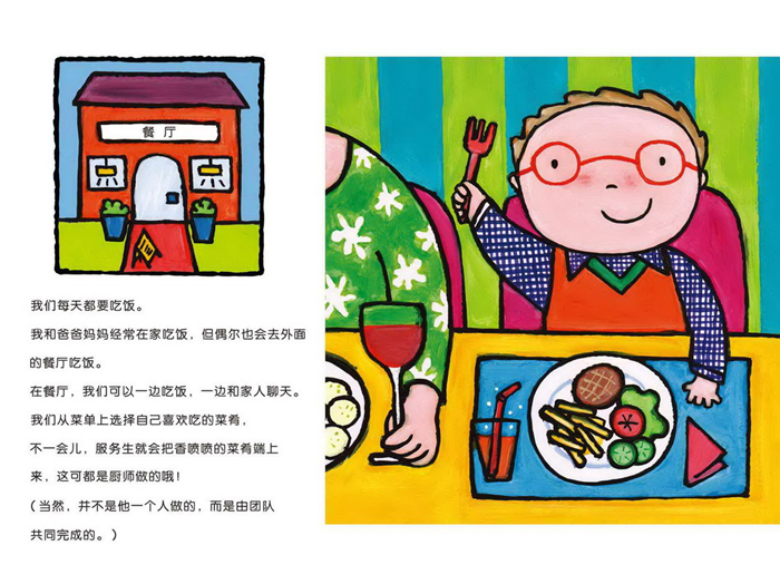 儿童绘本故事长大干什么——厨师,这套书介绍了每个职业所需要的工具及穿的制服,同时以小故事的形式讲解了每个职业每天需要做哪些事情,让孩子在故事中可以更加深入的体验该职业。这本书介绍的是职业是厨师
