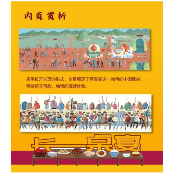 百家宴是我国古老的传统民俗文化,也叫合拢宴或者长桌宴,在特定的 节日或者节气中举办。这一习俗目的是为了“商议族事,祈盼丰收和太平”,《长长的宴席》取材于此。 ★ 本图画书采用拉开长页的形式,全景展现了百家宴这一独特的中国民俗, 带给孩子有趣、独特的阅读体验。 ★ 本图画书绘画风格独特,色彩丰富、饱满的装饰画风格,给孩子较高的 视觉艺术享受,有助于引导孩子了解并感受中华民族传统节日的文化习俗与魅力。