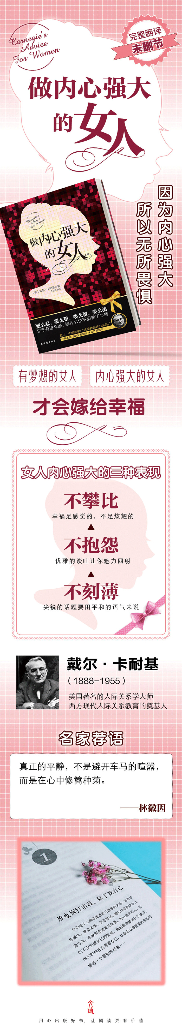 ★ 通过种种实验和数据,卡耐基向我们阐释女人作为一个独立的个体,可以战胜脆弱的内心,可以使我们产生一个新的自我,让我们变得更加自信、充满活力、也更有安全感。