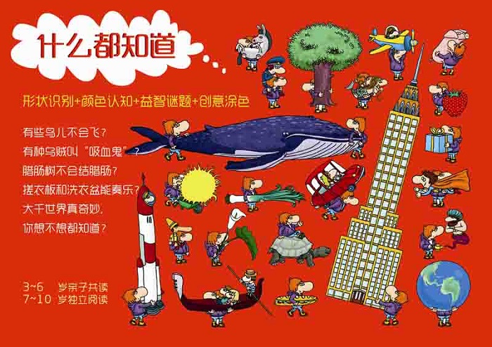 推荐一:《什么都知道》**次将“科普”与“益智启蒙”内容有效地结合,以图说的形式描绘了世界之大,是**本谜题形式的百科图鉴。孩子不仅可以从书中认知各种事物,还可以跟随一位大鼻子伙伴一边竞猜谜题,一边智力闯关。