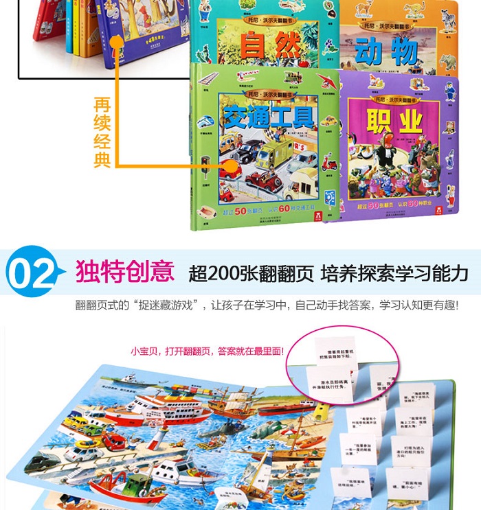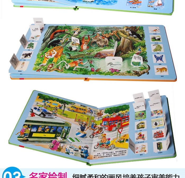 更是以培养孩子的想象思维能力为主,进行“翻翻页”的设计与内容的编排。每册书都将宝宝需要认知的事物整齐的排放在书中大场景的四周。宝宝通过认知完这些单个小事物后,需要在书中的大场景里找找他们都藏在哪儿。这样的阅读形式不但能给孩子带来对事物的基本认知,而且它也无形中培养着孩子的想象力与思维能力