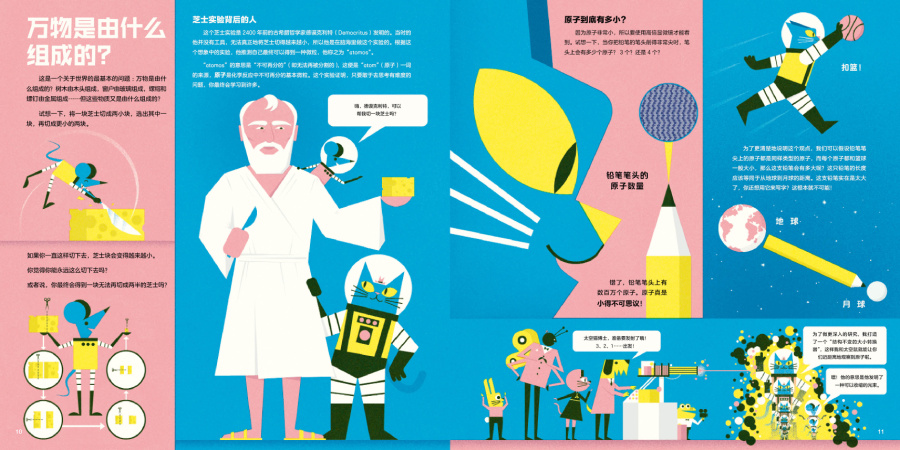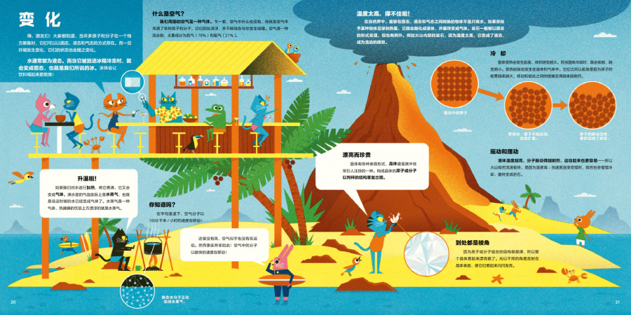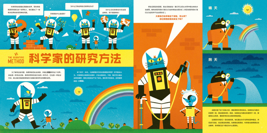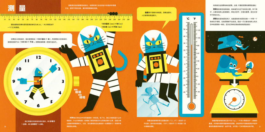 《太空猫:物理大爆炸》首先吸引我的是它的色彩,利用大面积的橙色、蓝色、粉红色和明黄色色块将画面分割成了几个部分。这样以来,复杂的知识点也被分解成若干块,条理变得清晰,理解起来也更容易。翻开书页,是孩子们喜爱的卡通人物——太空猫、太空鼠和太空熊等。他们是现实小孩*鲜明的写照——有时调皮捣蛋,但探索起科学来又十分认真。没有说教,利用明亮、活泼的色彩吸引孩子的注意力,跟着书中的小伙伴们来场物理世界的冒险之旅就能学到知识,是本书给我的*印象。