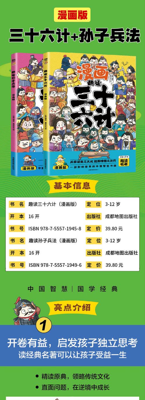 《三十六计》是一部集历代兵家诡道之大成的兵书,用漫画的形式总结了以往战争中施计用诈的实践经验,包含有朴素的军事辩证思想,被兵家广为援用。很好的提升孩子对阅读的兴趣!