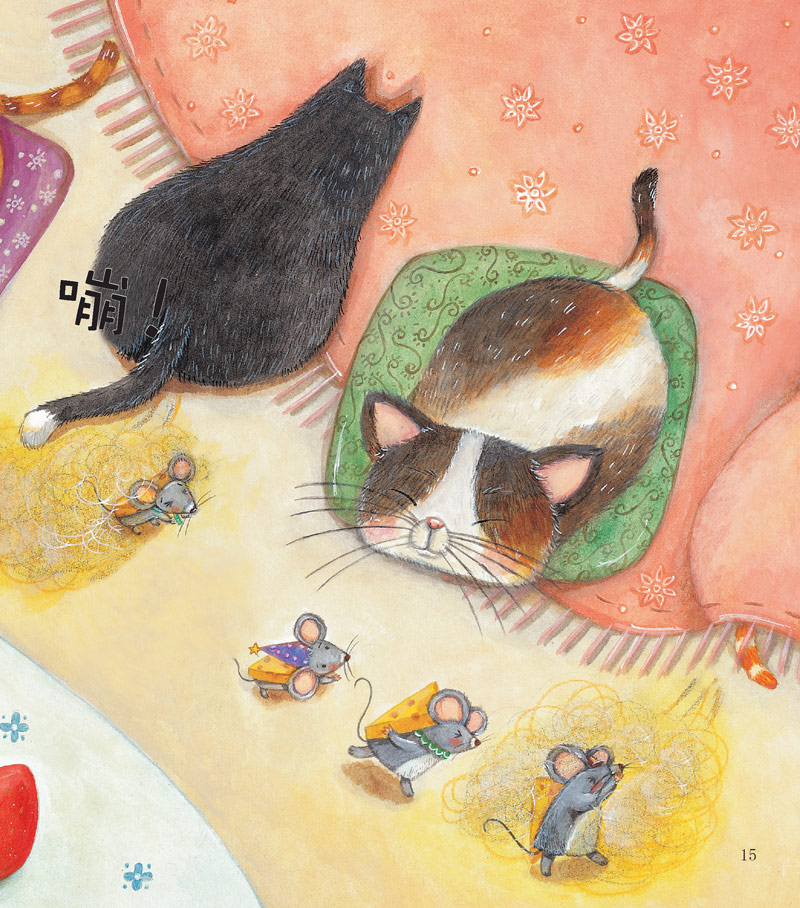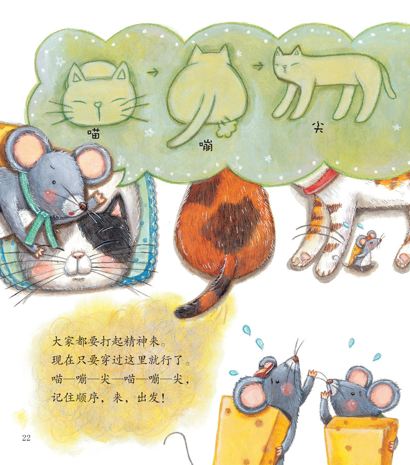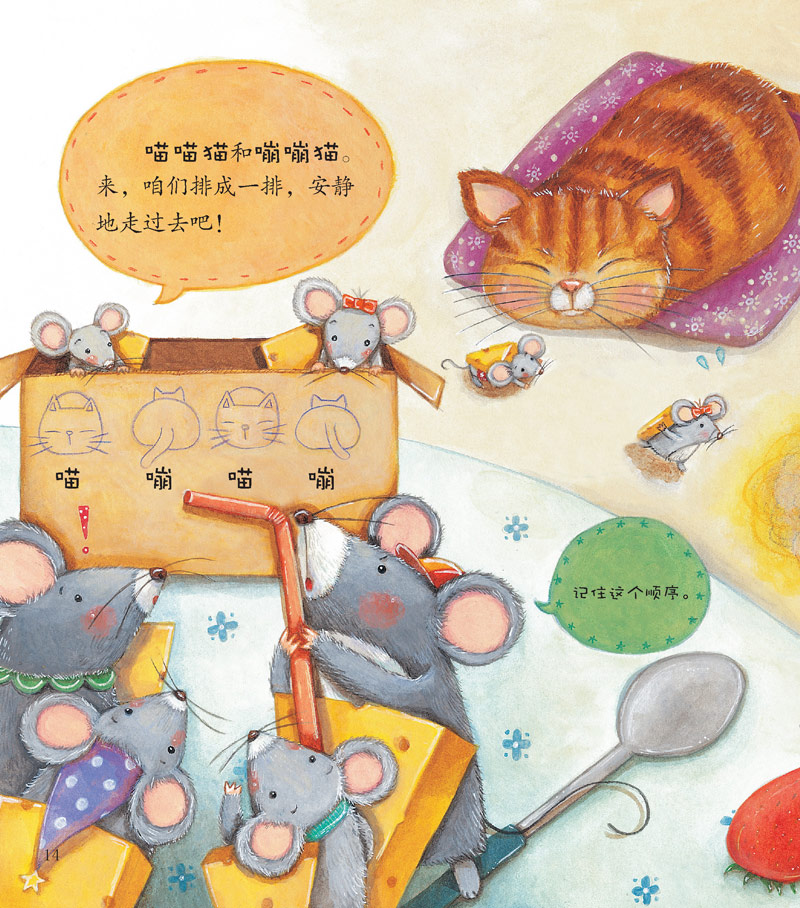 喵喵猫的胡子长长的,嘣嘣猫放屁“嘣嘣嘣”的,尖尖猫的爪子尖尖的。小老鼠们要想从猫群里穿过,拿到好吃的起司,该按什么样的规律走呢?小老鼠能找到猫咪排列的规律,搬走好吃的起司吗?