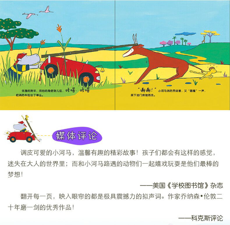 今天,小小河马消防员火速疾驰,消防车上还装了四个不能报警的警示灯。咦?他的消防车该怎么停下来呢?这可难倒了小河马。真糟糕,他掉进了脏脏臭臭的泥巴洞。然后呢,哎呀呀,他又碰到了斜小坡,那里有一只好高好高的长颈鹿。幸好幸好,小河马有好多好朋友来帮忙。可是,真的着大火啦,他该怎么办呀?小小河马消防员开动脑筋,终于当了一回勇敢的消防员。