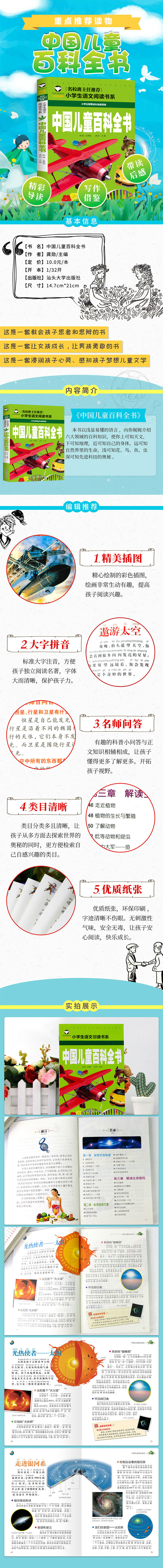 这本《中国儿童百科全书》以浅显易懂的语言向你娓娓讲解天文地理、自然界里的生命、声光形色、科技奥秘、历史时空等百科知识。同时每个主题都配有内容丰富的U资料它们能很好地解答你心中的疑惑并拓展你的视野。除此之外本书*的亮点就是图文并茂。生动传神的图片一目了然的原理构造图示能让你充分体验到获取知识的快乐。