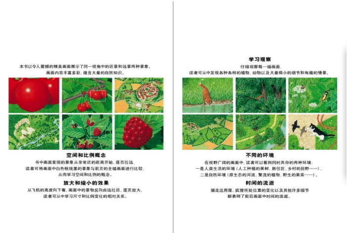书中画面呈现的景象从非常近的距离开始,逐页拉远,读者可将画面中白色框线里的景象与前页的全幅画面进行比较,从而学习空间距离和比例的概念。