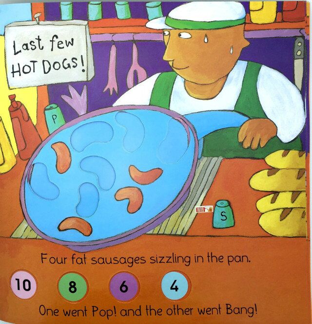 胖厨师的锅里有十根肥香肠,一根爆炸了,另一根也爆炸了,还剩几根呢?小朋友快来数一数。这首英文儿歌不仅锻炼小朋友的口语表达能力,同时渗透了10以内的减法。有趣的洞洞书设计能帮助宝宝进行算术的学习。