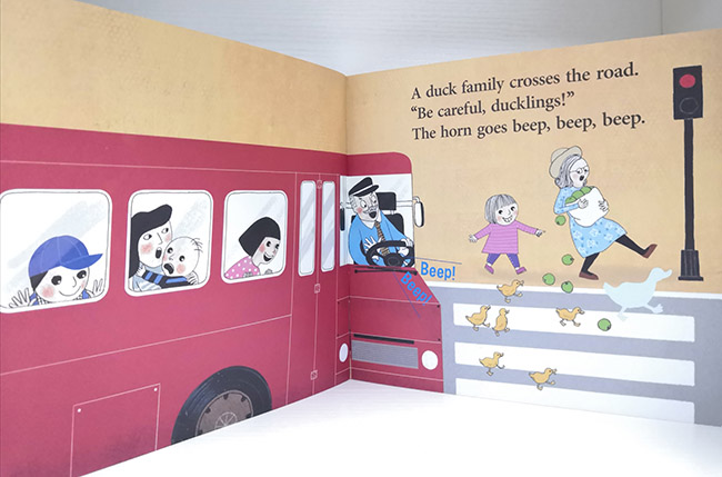 红色公交车载着乘客在大街小巷穿梭,轮子转呀转,满载着乘客向前跑。在车上将听到许多不同的声音。