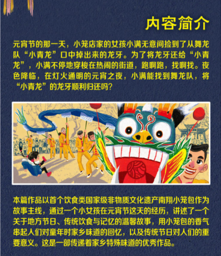 本书以非物质文化遗产南翔小笼包以及小青龙舞龙会为主线,在女孩小满寻找小青龙的过程中又囊括了江桥白切羊肉、石丹担石锁、黄渡沪书等多个非物质文化遗产,视角独特、内容新鲜、故事完整,同时又具有浓厚的民族特色,能够吸引小读者的阅读兴趣。作品通过小女孩找龙牙的故事,传递出的是对童年的怀念、对故乡的思念、对传统的眷恋,潜移默化地传播了传统文化,建立文化自信与认同感。